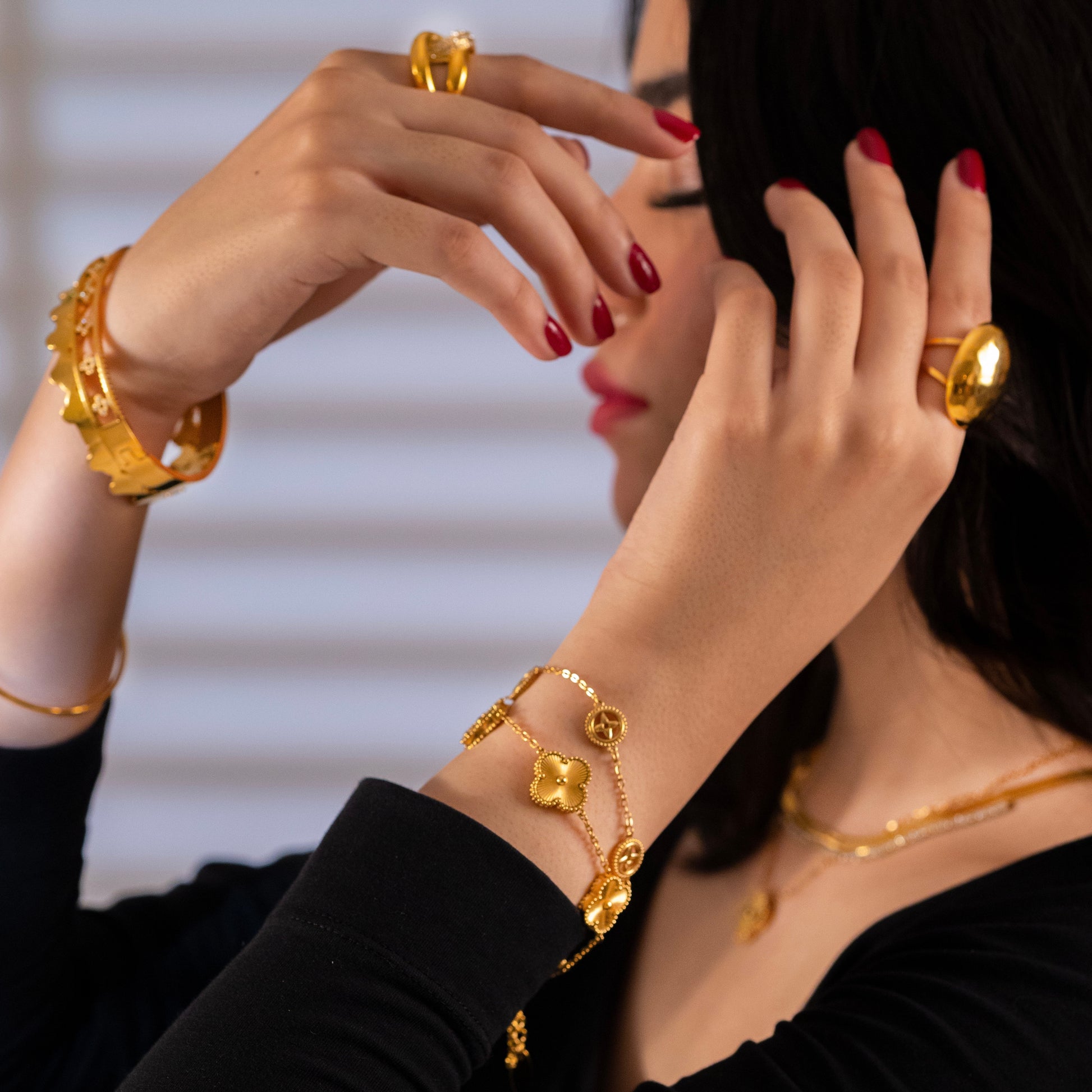 Embrace elegance with the Muse bracelet, featuring five charming golden four-leaf clovers that inspire luck and positivity. Gracefully adorning your wrist, this enchanting piece is perfect for everyday wear, adding a touch of whimsy and sophistication to your style. Let the Muse bracelet be your daily reminder to embrace joy and seize every moment.