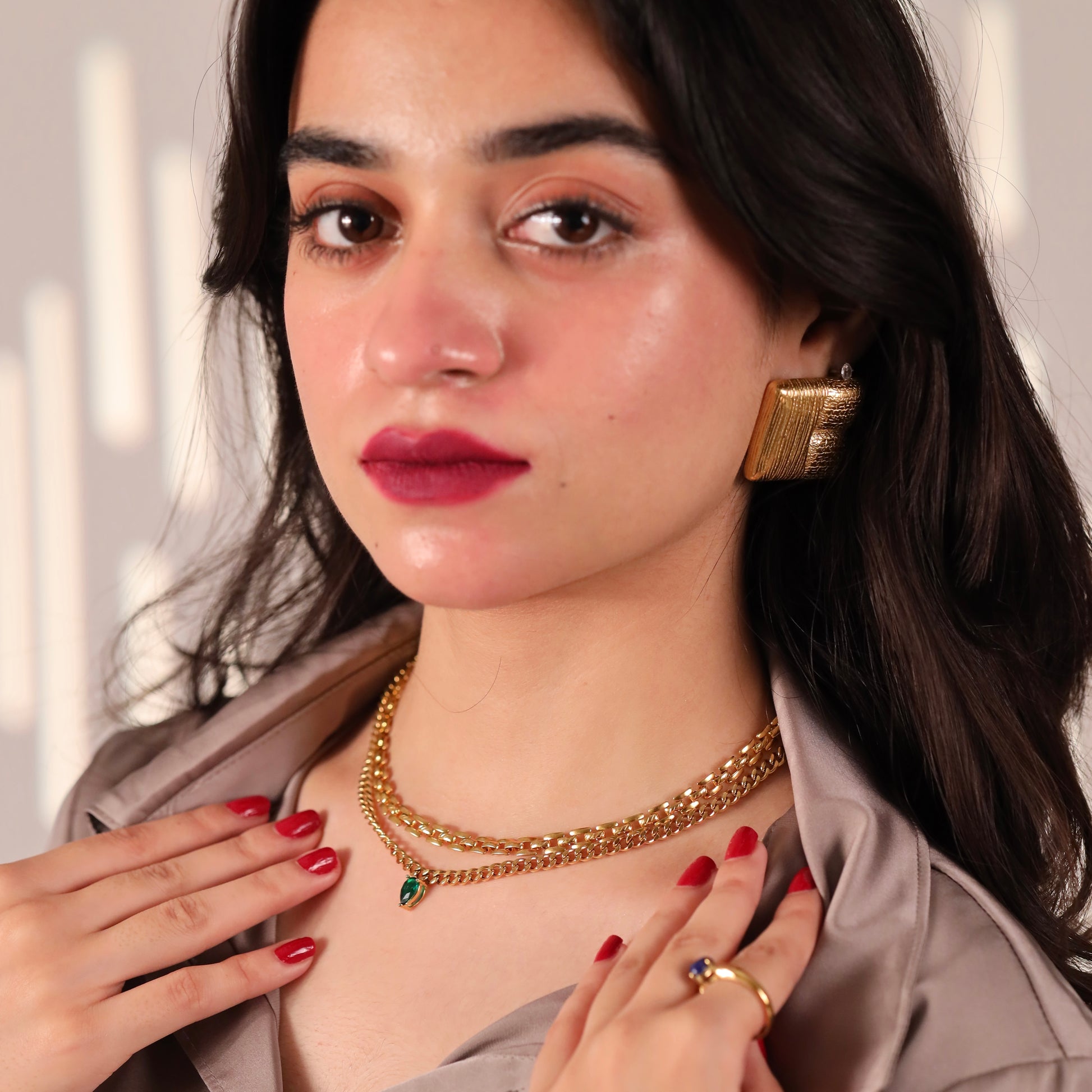 With its striking green drop, this piece radiates a bold allure, capturing nature's richness in every facet. A statement of elegance that draws the eye, perfect for adding vibrant energy to your style.